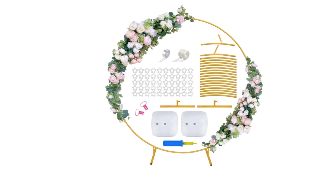 - 1×round balloon arch stand, 2×water bags, 50×balloon clips, 1×manual. We provide you with two water bags, each of which can hold 8 kg of water to increase the stability of the round arch backdrop stand. The portable storage bag can easily store the removed metal arch backdrop stand, which can save more space, and can carry the balloon arch kit anywhere to use.