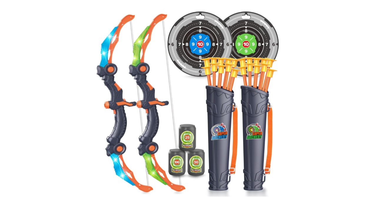 - 2-in-1 Shooting Games: Our upgraded shooting toy set features two shooting targets, offering double the fun for children’s play. The set includes two collapsible bows with LED lights, 20 suction cup arrows, two adjustable shoulder strap quivers, two shooting practice targets, and three target cans. With this comprehensive archery equipment, players will have an immersive and exciting gaming experience.