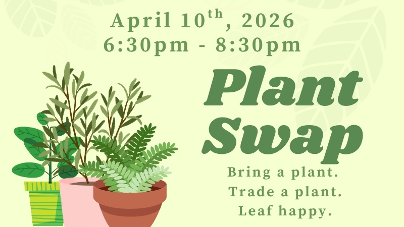 Bring a plant (or a starter) and leave with one! Friday, April 10th, 6:30-8:30p.m. Reach out with any questions. |