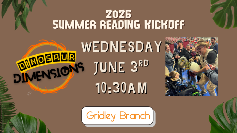 Join us to kick off the 2026 Summer Reading program, Unearth a Story, with Dinosaur Dimensions! Meet and greet dinosaurs and participate in an exciting interactive program!