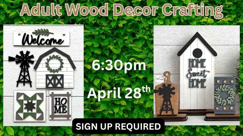 Adult wood decor crafting. April 28th at 6:30 p.m. Sign up Required. Please contact Lebo Branch to RSVP. (620) 256-6452 |
