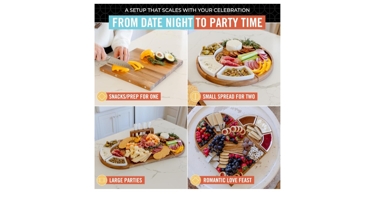 - Our large, magnetic charcuterie board centers around a 13” x 13” square board, ideal for a small gathering, and when you attach the two magnetic semi-circle end pieces, it expands to 26″ x 13” – perfect for a large party. You can arrange the long board altogether, as a circle and square, and even as a heart shape! This flexibility lets you adjust the board’s size and shape to match the occasion.