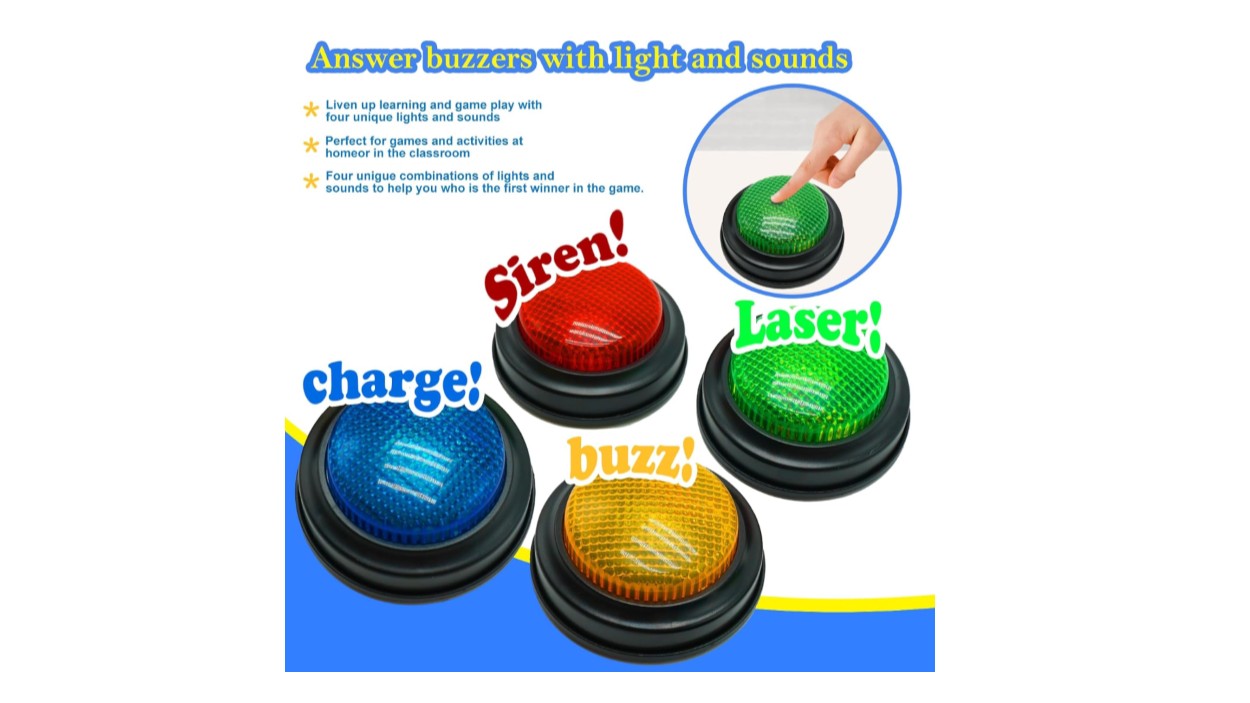 - Interactive Fun: Includes 4 colorful buzzers (blue, green, yellow, red), perfect for group activities and team-based games, Each buzzer lights up and makes a distinct sound (Charge, Laser, Buzz, Siren), adding excitement and clear identification to each player’s response
