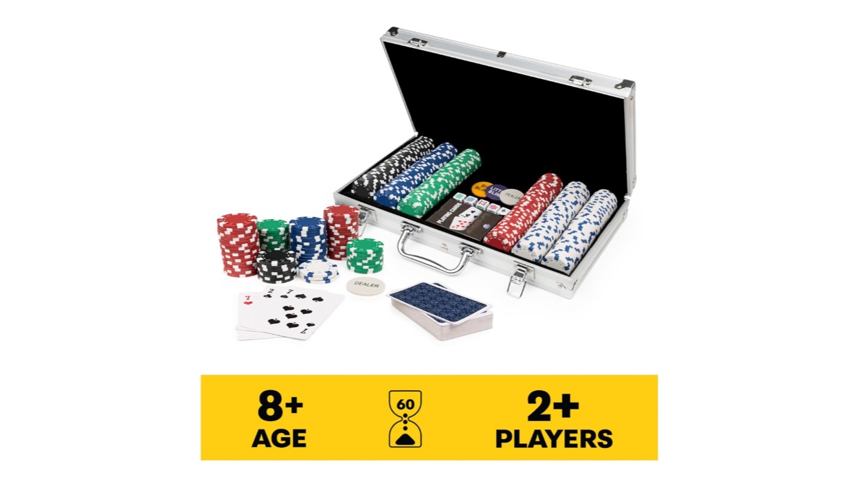 - EVERYTHING YOU NEED: For 2 or more players, ages 8+- this set includes 300 professional weight poker chips, 1 deck of cards, 1 dealer button, 2 betting buttons, 5 poker dice, and instructions
