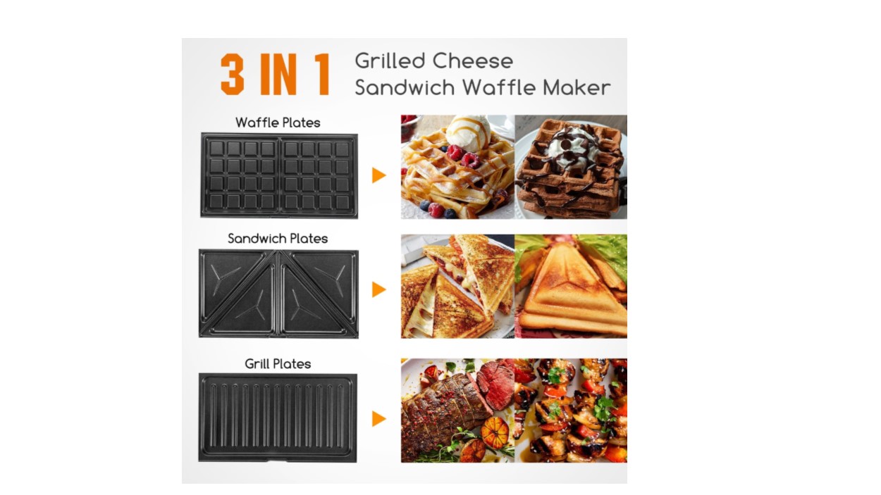 - 3 in 1 Sandwich Maker: With detachable plates for paninis, grilling, and waffles. You can cook a variety of meals. Use it to make hot sandwich, grill burgers, veggies, and chicken, or make fluffy waffles and hash browns