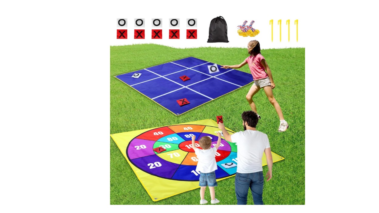 - 2 in 1 Fun Yard Game for Kids and Adults: This lawn games combines two games into one game mat. One side is bean bag toss game, and the other side is the Giant Tic Tac Toe game. This backyard game can be made easier by getting closer, or harder by standing further away which makes it fun for all ages